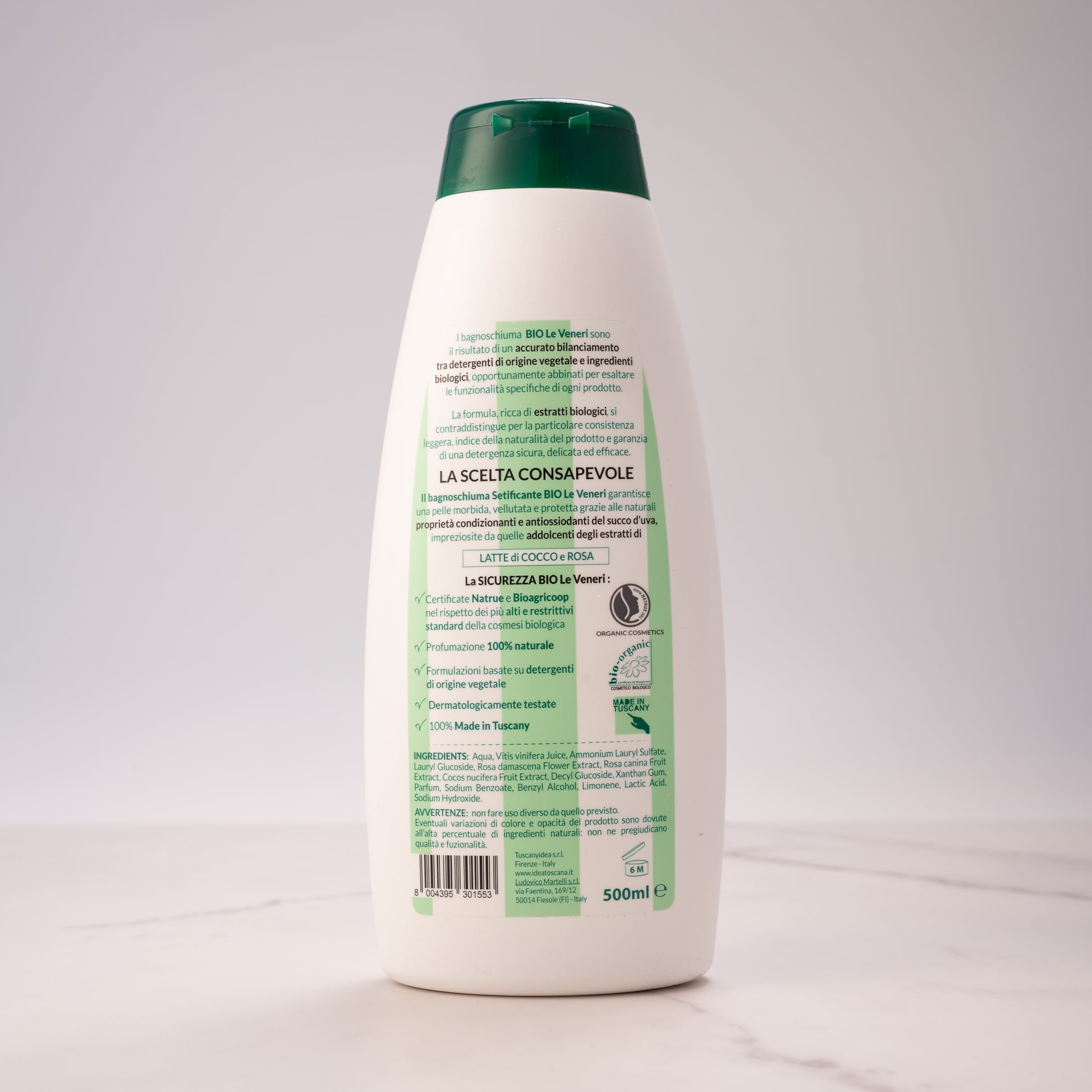 Le Veneri BIO Silky Bath Foam guarantees soft, velvety and protected skin thanks to the natural conditioning and antioxidant properties of grape juice , enhanced by the softening properties of COCONUT MILK and ROSE extracts.