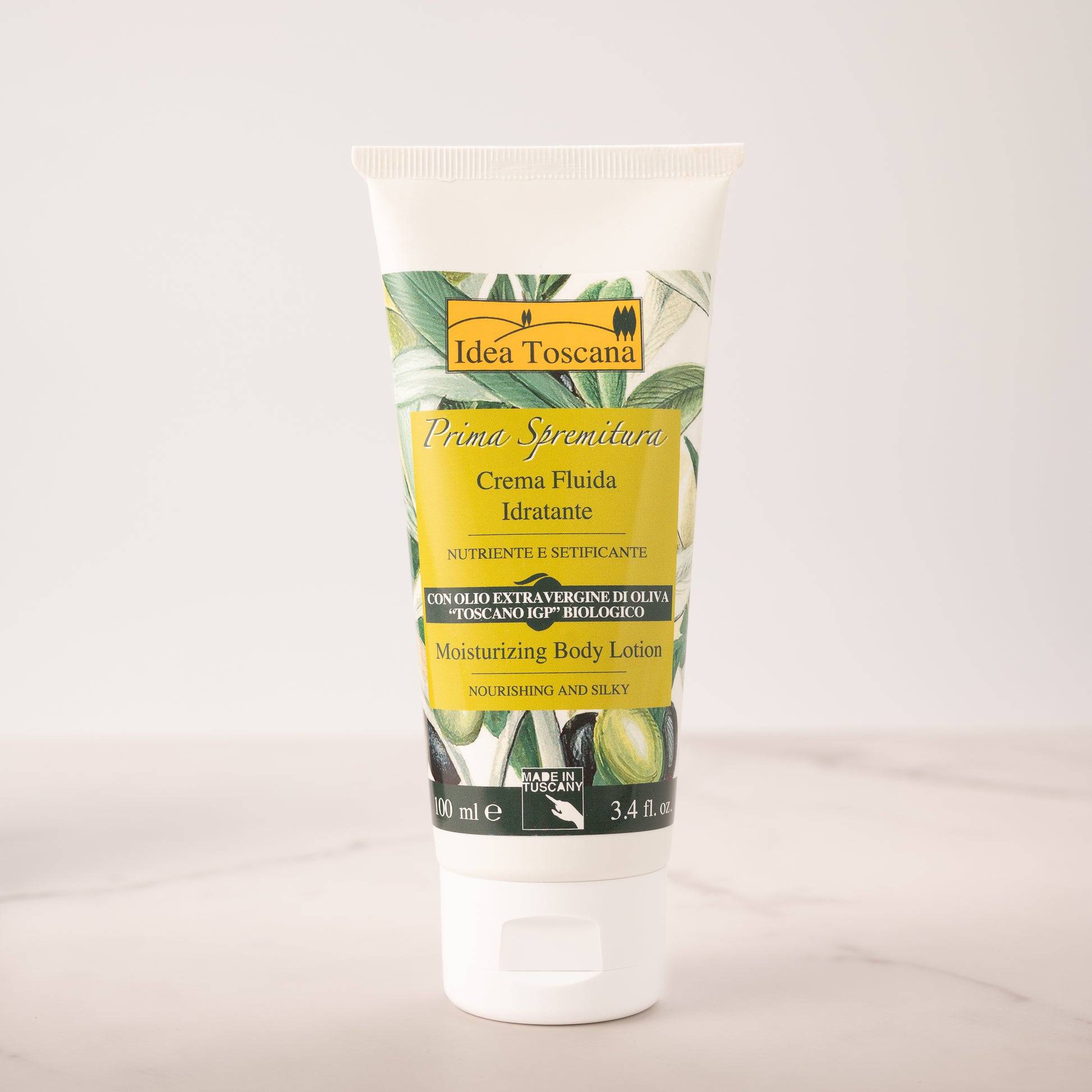 the exclusive formulation, enriched with active plant ingredients such as Organic Tuscan IGP Extra Virgin Olive Oil, Shea Butter and Cocoa Butter, gives the skin nourishment and well-being.
