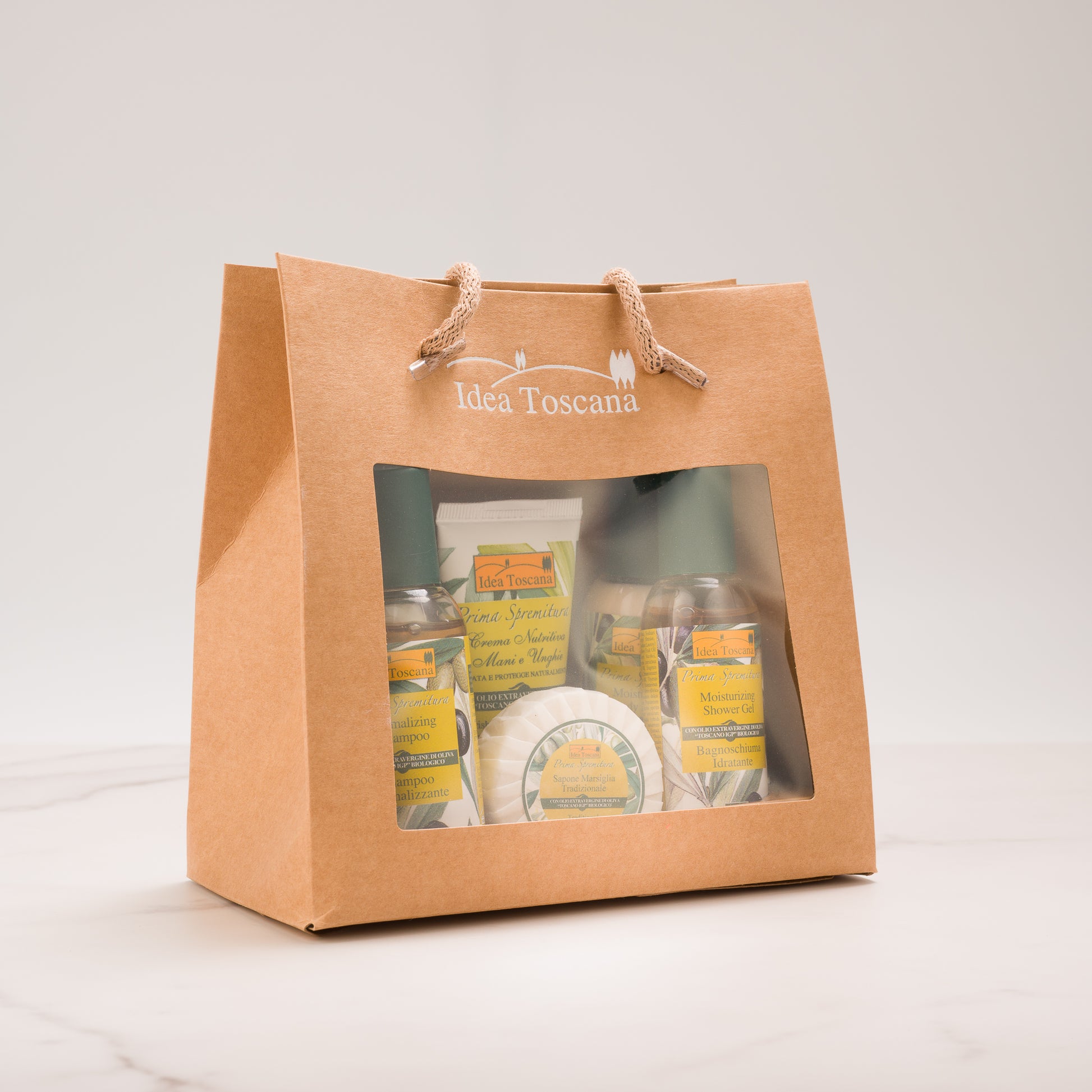The most surprising gift idea is the ecological gift bag, made up of products for the care of our body, from hair to toe. Natural Cosmetics of the Prima Spremitura Line with Organic "Tuscan IGP" Extra Virgin Olive Oil in travel-size formats that guarantee effectiveness and quality with a careful and aware "green heart"!