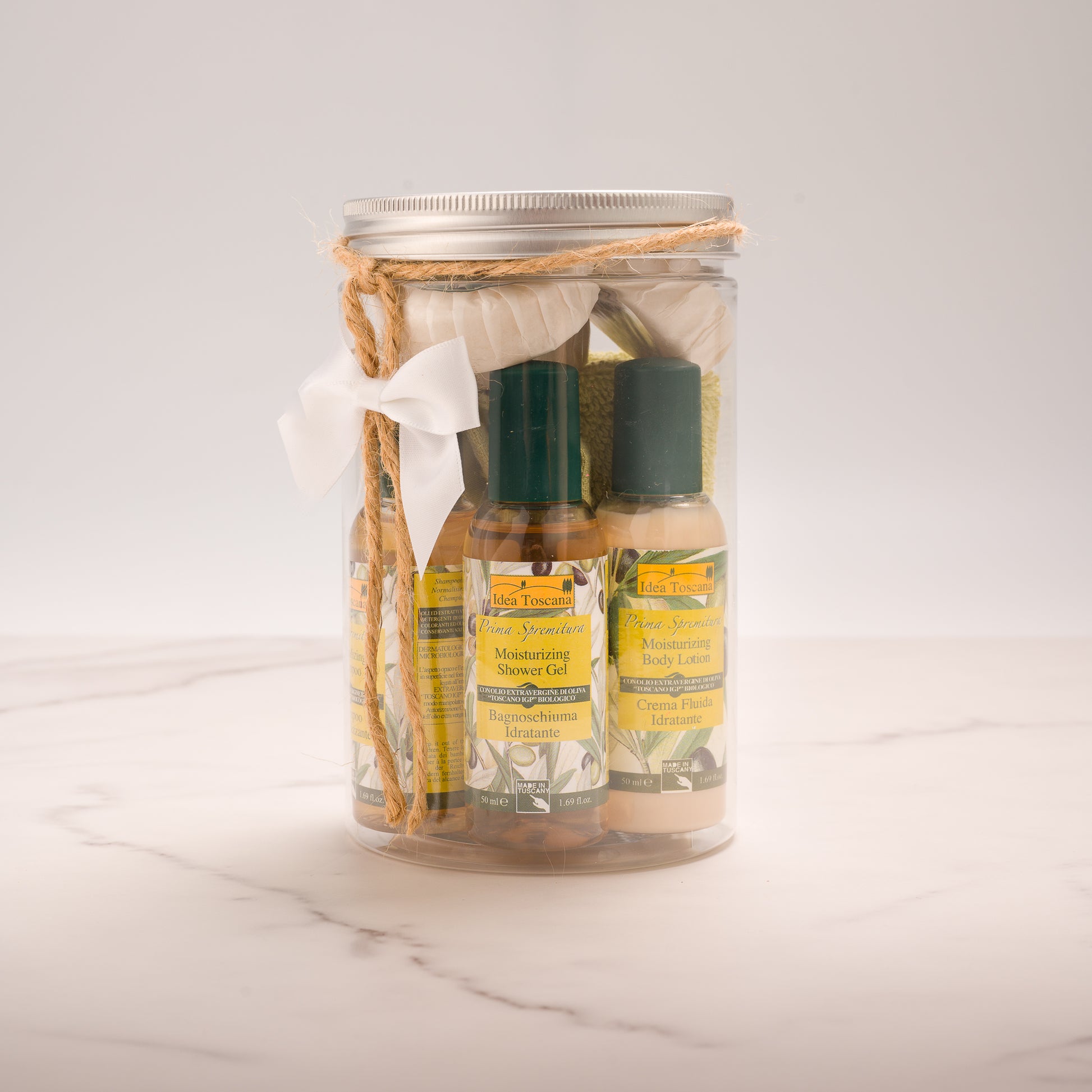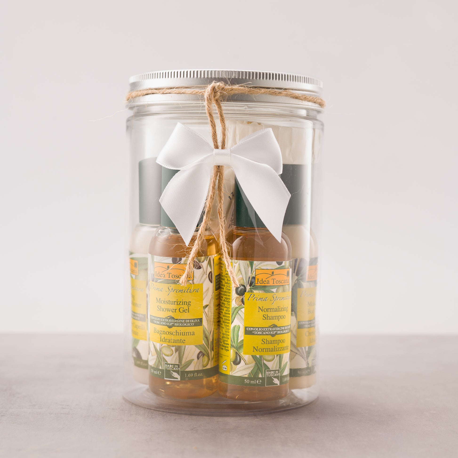 A refined gift that will make the recipient happy and at the same time protect the environment. The best natural cosmetics from the Prima Spremitura line with Organic "Toscano IGP" Extra Virgin Olive Oil in practical travel-size formats arranged in an elegant reusable and completely recyclable jar is a special, unique and original thought for friends and relatives.